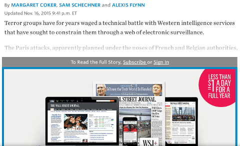 Numa lista de discussão sobre segurança digital, um colega linkou para uma matéria do Wall Street Journal (WSJ), "How Islamic State Teaches Tech Savvy to Evade Detection", cujo título e chamada insinuam haver expertise entre terroristas do estado islâmico (ISIS) sobre o uso de criptografia, que permite evasão da vigilância global. A matéria se esconde atrás de um muro de pagamento, mas o colega dá a entender que a mesma inclui uma lista de aplicativos que usam criptografia para isso, as quais são recomendados pelo ISIS de acordo com determinada classificação de eficácia. Ele também linkou para uma outra lista semelhante, publicada pela Electronic Frontier Foundation (EFF), pedindo comentários comparativos entre ambas listas.