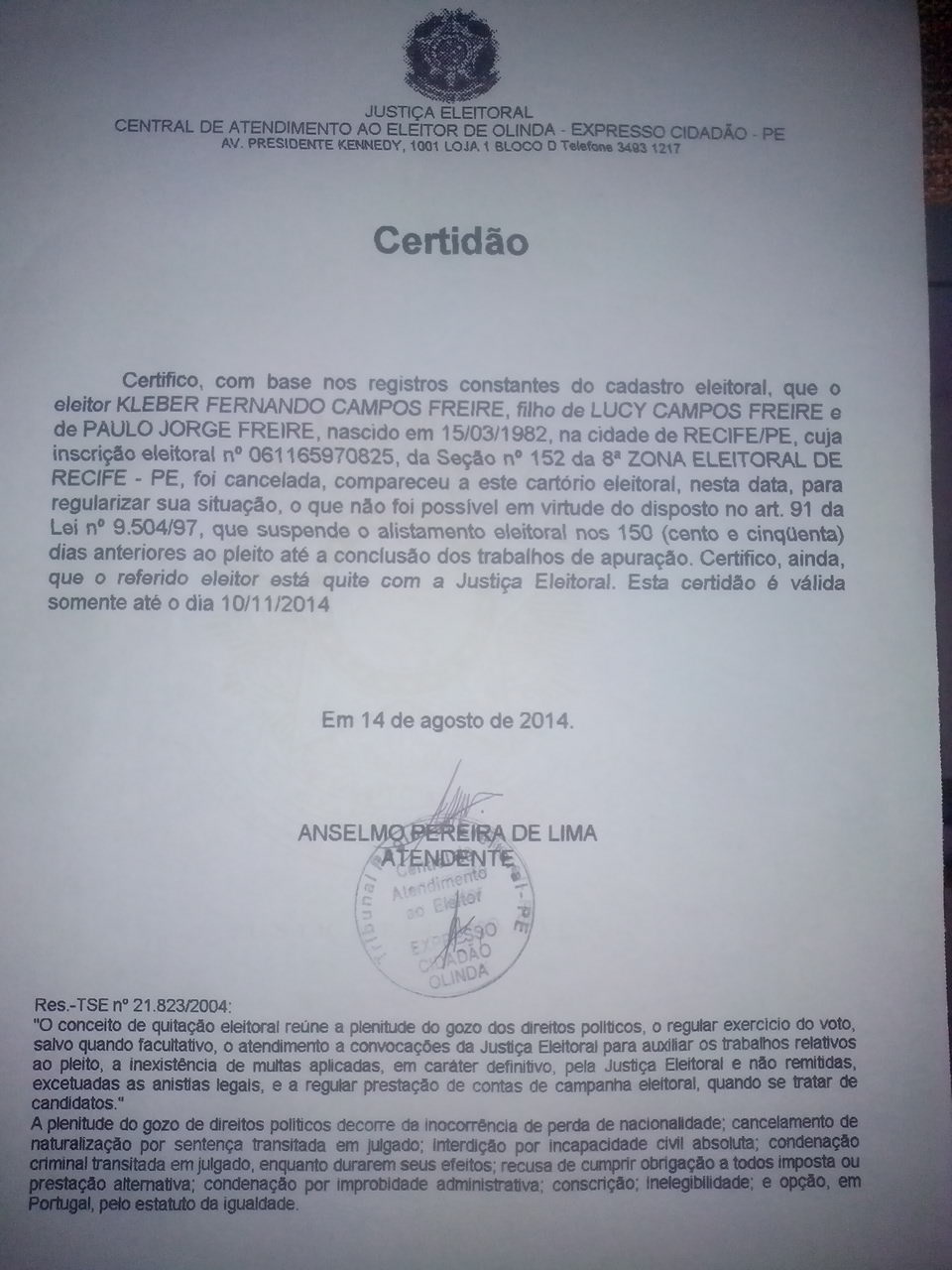 emitido pelo cartório da respectiva zona